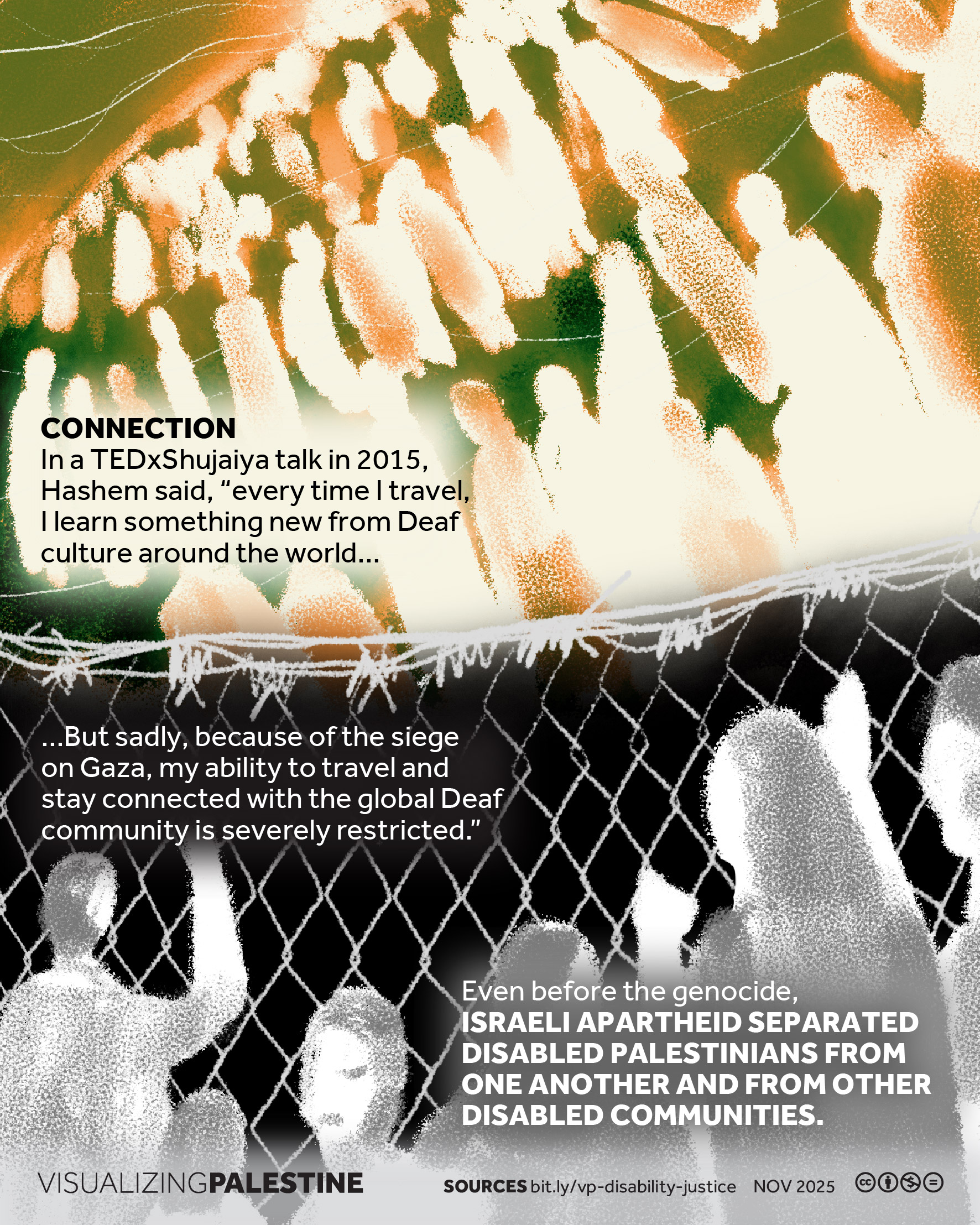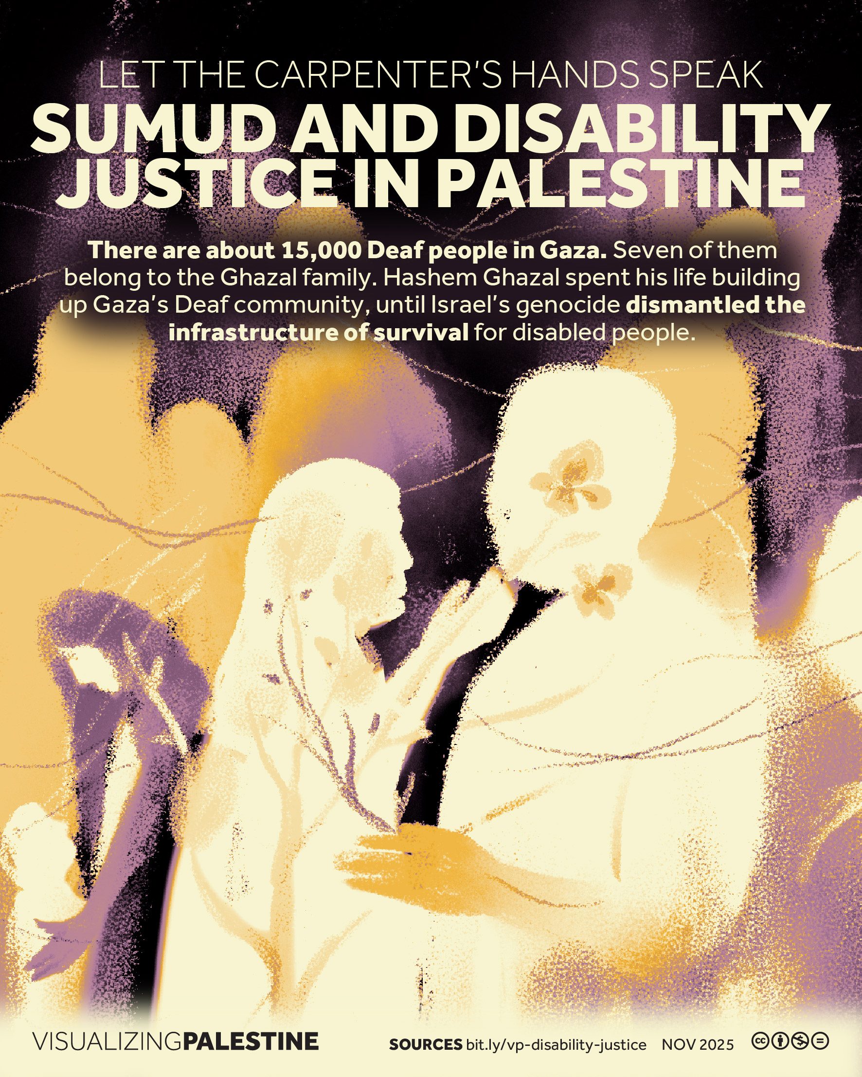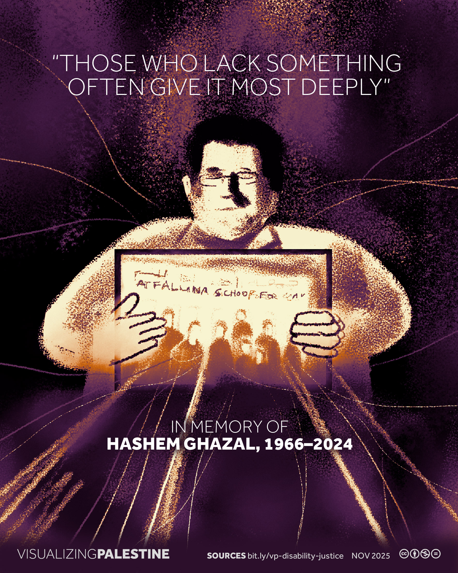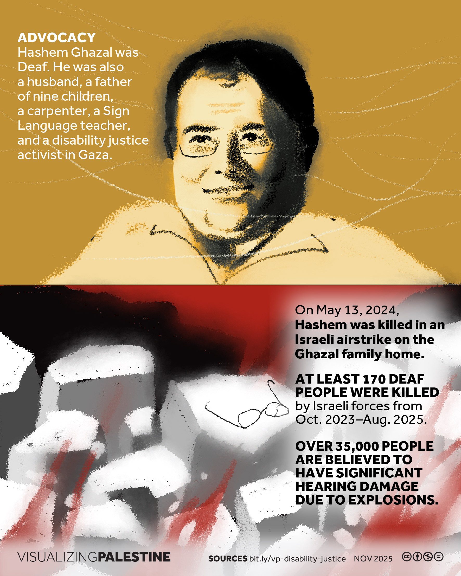 [November 2025]. This visual, created in consultation with a Palestinian network of Disability Justice researchers, shares the story of Hashem Ghazzal, a prominent Deaf community leader who dedicated his life to ensuring that Deaf Palestinians could live a life of dignity in Gaza.