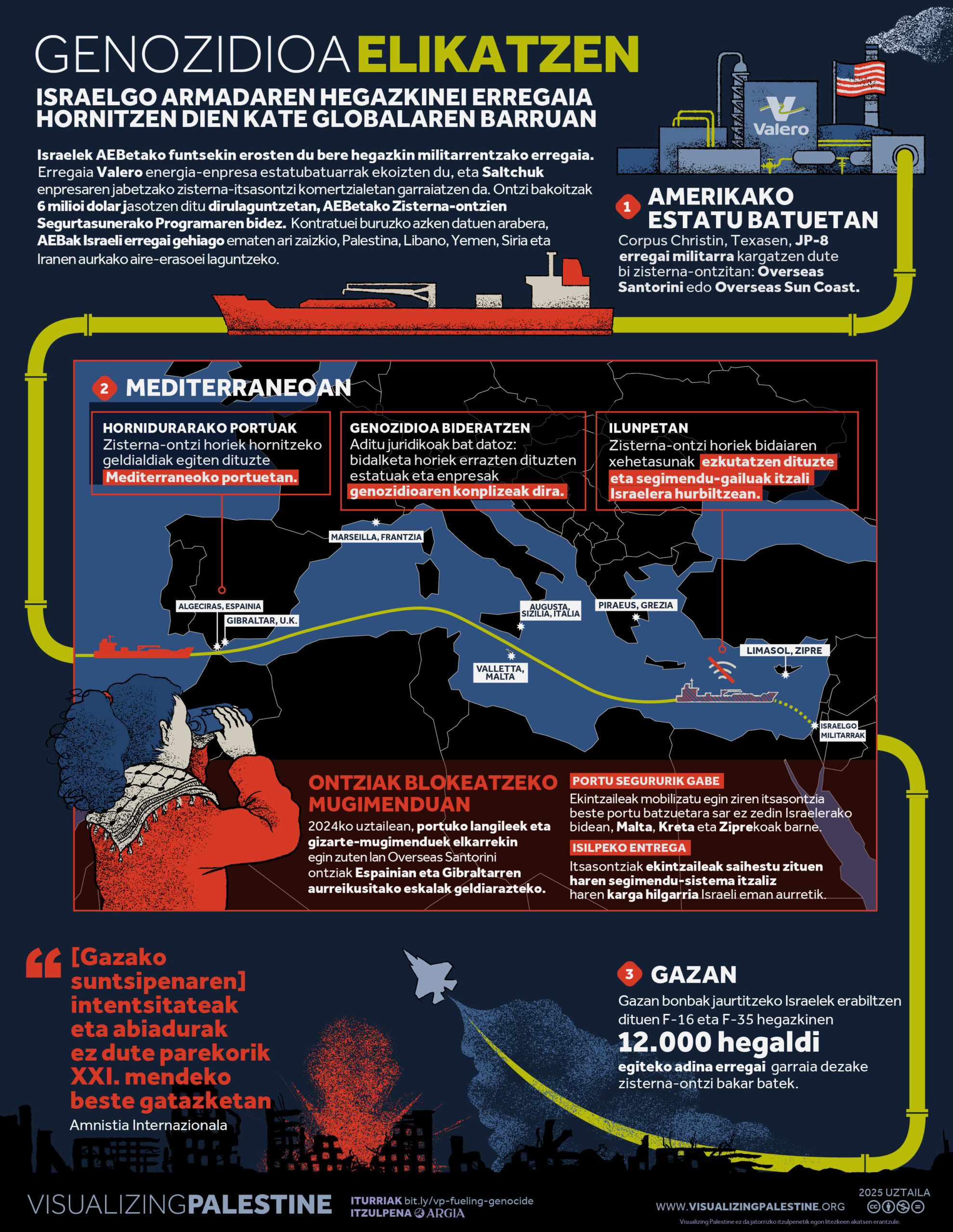 [2025eko uztaila]. Israelek Gazan egindako genozidio-bonbardaketa kanpaina bultzatu du AEBetako hornitzaileek egindako erregai militarraren bidalketen gorakadak. Irudi honetan, hornidura-kate honetan konplize diren enpresak eta gobernuak agerian uzten ditugu, eta, aldi berean, zama hilgarri hau ekintza zuzenaren, boikot-kanpainen eta komunitatearen erresistentziaren bidez jarraitzeko eta eteteko oinarrizko ahaleginak nabarmentzen ditugu.